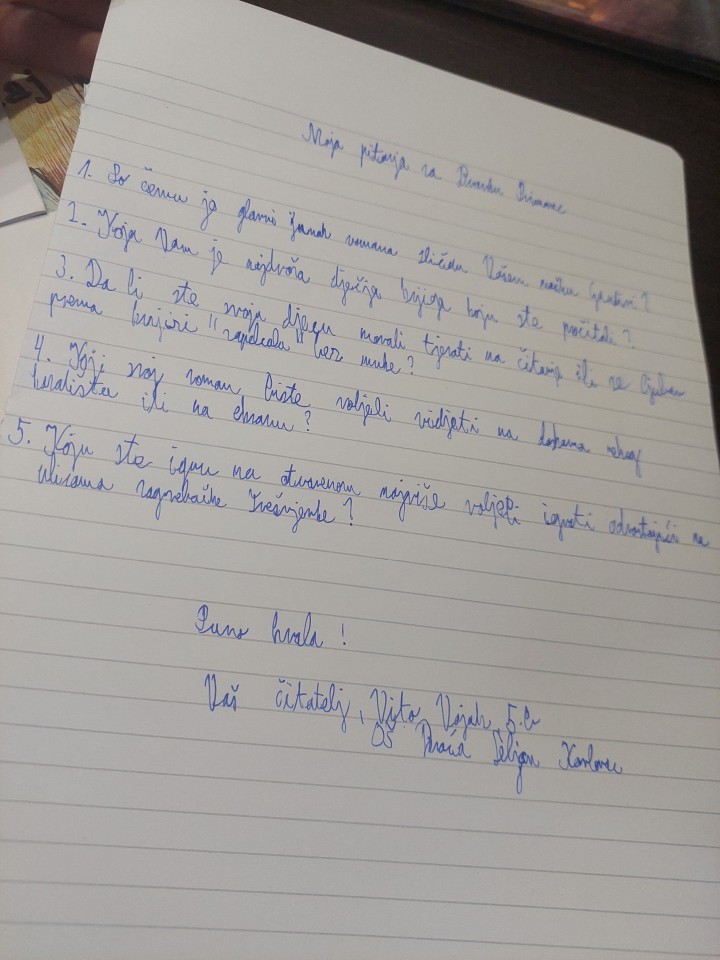 Iskoristit ću priliku da vas zamolim ako ste u mogućnosti da odgovorite na nekoliko Vitinih pitanja koja će biti dio njegovog rada lektire. Rado bih organizirala vaš dolazak u školu ili u našu “Knjiguljicu”, prvu specijaliziranu dječju knjižaru u Hrvatskoj... i žalosna sam što se takva interakcija s dječjim piscima ne dešava dovoljno često...