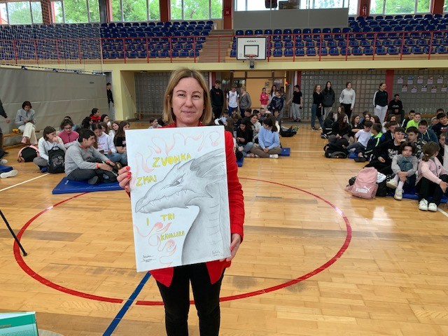 Većina nastavnika na ovoj proljetnoj turneji po našim istočnim županijama ugodno me iznenadila idejama za što uspješnijih četrdeset i pet minuta razgovora o spisateljskom radu, što znači o svemu i svačemu ali najviše o knjigama koje sam napisala a učenici čitali za lektiru. Poslije sadržajnog susreta u Suhopolju posjećujemo OŠ August Cesarec u Špišić Bukovici u kojoj ćemo se družiti više od školskog sata jer su mlade novinarke Tena Pokupić i Klara Štimac zamolile za intervju. Pripremila ih je njihova učiteljica Vanda Barić. Svi u organizaciji potrudili su se raznim sadržajima ispuniti vrijeme, uljepšati pozornicu. Vidim veliki poster s mojim portretom i druge plakate od kojih je usred velikog prostoru sportske dvorana napravljeno intimnije mjesto. Dvorana zbog eha nije omiljena, koliko znam, nijednom književniku. No, u Špišić Bukovici sve je bilo prilagođeno drugačijoj sceni od sportske. Publika je blizu, na parketu, a ne na tribinama kao na košarkaškoj utakmici. Učenici su bili koncentrirani, strpljivi i činilo se zainteresirani za priču. Sjedim u školskoj klupi ispred mojih knjiga, koje uvijek pri ruci ima Alfina promotorica Dinae G. Kovač. Za intervju moram preseliti na plavi kožni dvosjed, onakav kakav se viđa na festivalima i sajmovima poput Frankfurtskog ili Zagrebačkog, Pulskog. Baš štosno! Simpatični učenik kao pravi profesionalac snimao je cijeli susret videokamerom.