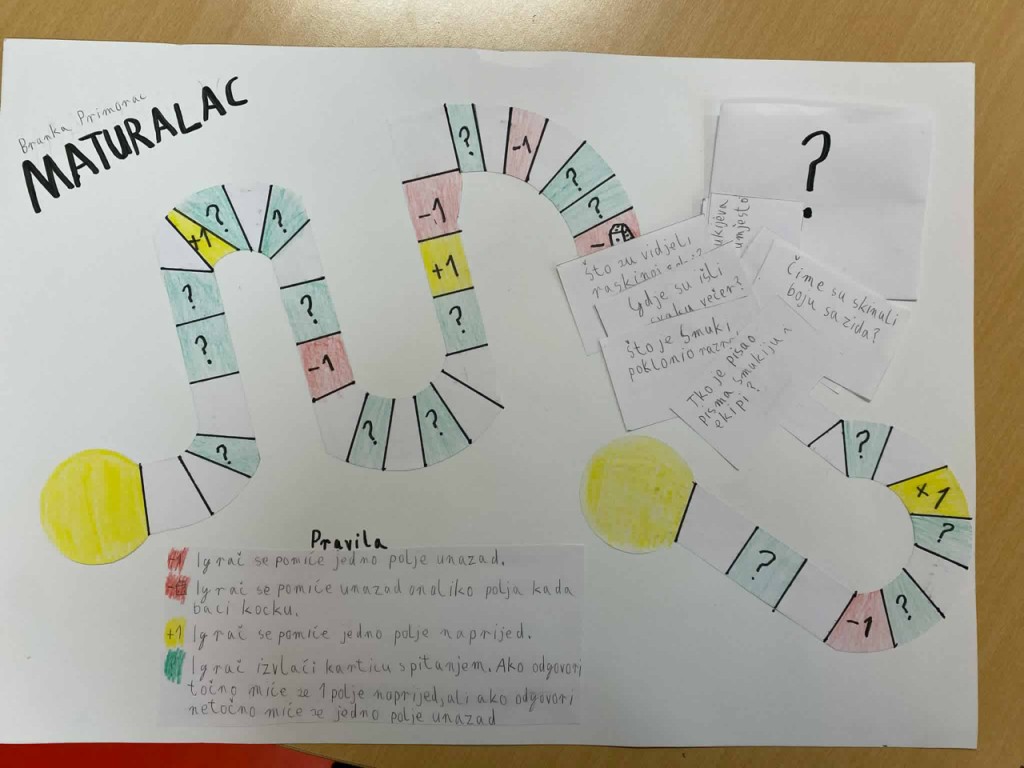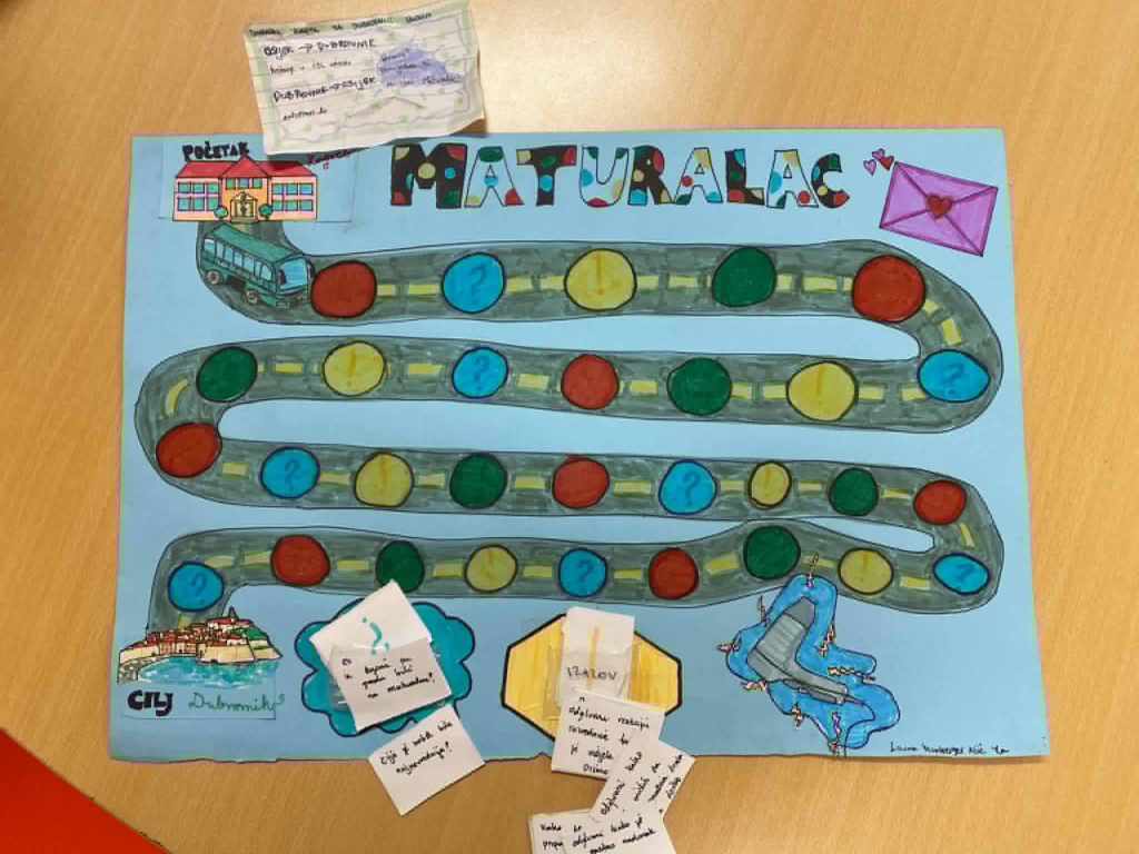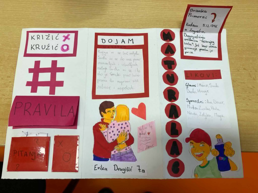 Još malo ćemo se zadržati na istoku zemlje. Doduše, nije riječ o živom kontaktu sa čitateljima već na daljinu, a uz pomoć moje drage prijateljice prof. Anite Šojat iz osječke OŠ Ljudevit Gaj. Ona i njezini učenici me svake godine iznenade radovima s projektne nastave iz lektire na temu moje knjige. Fotografije radova dobila sam krajem prošle školske godine 2024/25. iznenađena količinom i kreativnošću. Najoriginalniji je Maturalac u obliku igre Čovječe ne ljuti se. Fotografije će to najbolje dočarati. Moj komentar da ih ima puno popraćen je rečenicom: