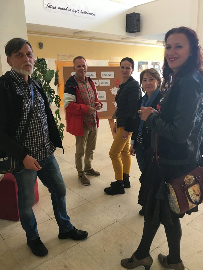 Prije odlaska domaćini su nas počastili ručkom na kojem su Mlinarec, Bakarić i Čvorović pričali dojmove sa svojih druženja s pučkoškolcima. Bilo je duhovito. Aleksandru je čak jedan prvoškolac pitao kakvu to sliku ima na čarapi. Oduševila se koliko je pozornosti izazvao njezin nastup i to kako je sedmogodišnjak primijetio sitni detalj. U međuvremenu nam se pridružio ravnatelj POU-a Dražen Malec, kasnije i gđa. Željka, pjesnikinja, supruga Jadranka Bitenca koju sam odavno željela upoznati. Izuzetno topla osoba koja zrači vedrinom. Na rastanku, naravno, posegnuli smo za mobitelima. Fotografije će biti u prilogu.