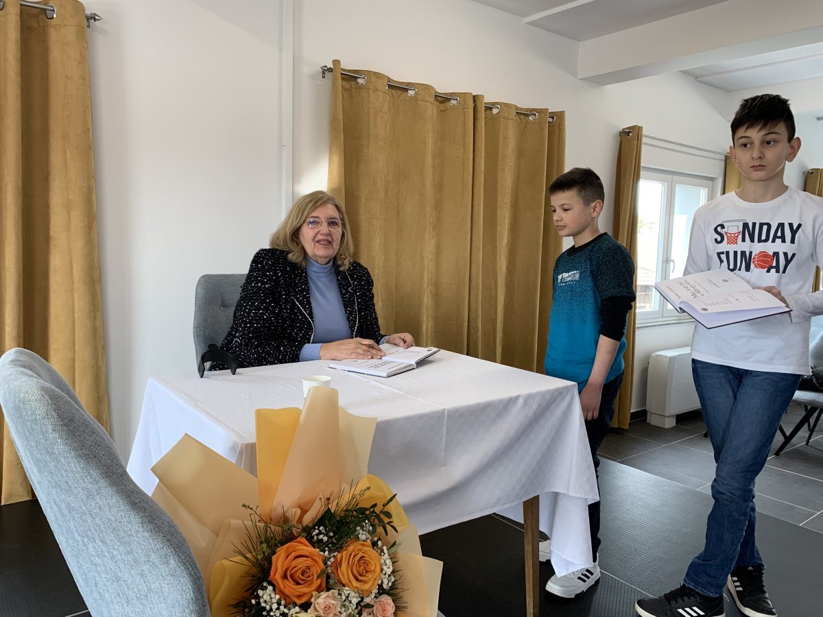 Bilo je uzbudljivo cijelog dana. S nestrpljenjem su se čekali rezultati pismenog kviza, a na kraju smo saznali da su najbolje bile dvije bjelovarske škole, a treća ekipa iz OŠ Dežanovac. Ponosno su pozirali s peharom dobivenim za treće mjesto s 40 od mogućih 50 bodova za točne odgovore. Iz te škole dolazi i Iyanla Iskra Stojaković, djevojčica čije je likovno rješenje na temu „Mog brata“ izabrano za zahvalnice i straničnike, lijep podsjetnik svim sudionicima pa i spisateljici na vrlo sadržajno i ugodno druženje. (Fotografiju mi je poslala njihova ponosna učiteljica Ankica Holubek, kad smo već bili na puta za Zagreb).